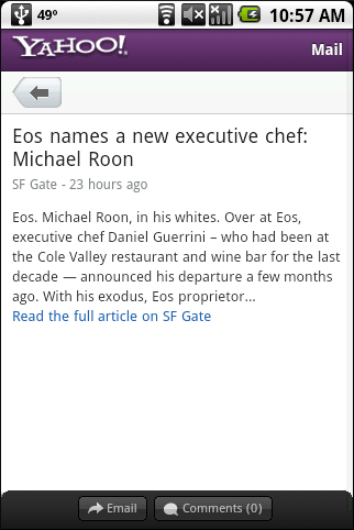 News items are presented as a list of headline links. Clicking a headline opens the story in a new page. If the item comes from a 3rd party site you can only get an excerpt but can click through to read the original, which is not always mobile formatted. While that’s not a big deal, the iOS and Android handle desktop pages just fine, it does take away from the integrated mobile experience of the rest of the Yahoo Local Beta.